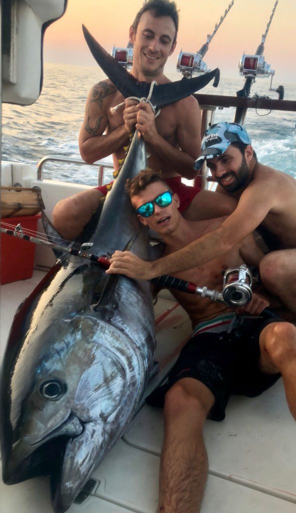 L’esperienza ci dice che i tonni sono attratti da questa combinazione. Ed infine terminiamo la strisciata con “l’imbuto”, cioè facciamo quattro o cinque giri concentrici a velocità sostenuta per creare più schiuma possibile buttando nell’occhio del gorgo ancora pezzi di sarda. Usciamo dal vortice controcorrente per 50 – 60 metri per poi tornarci sopra una volta filata ala cima dell’ancora.