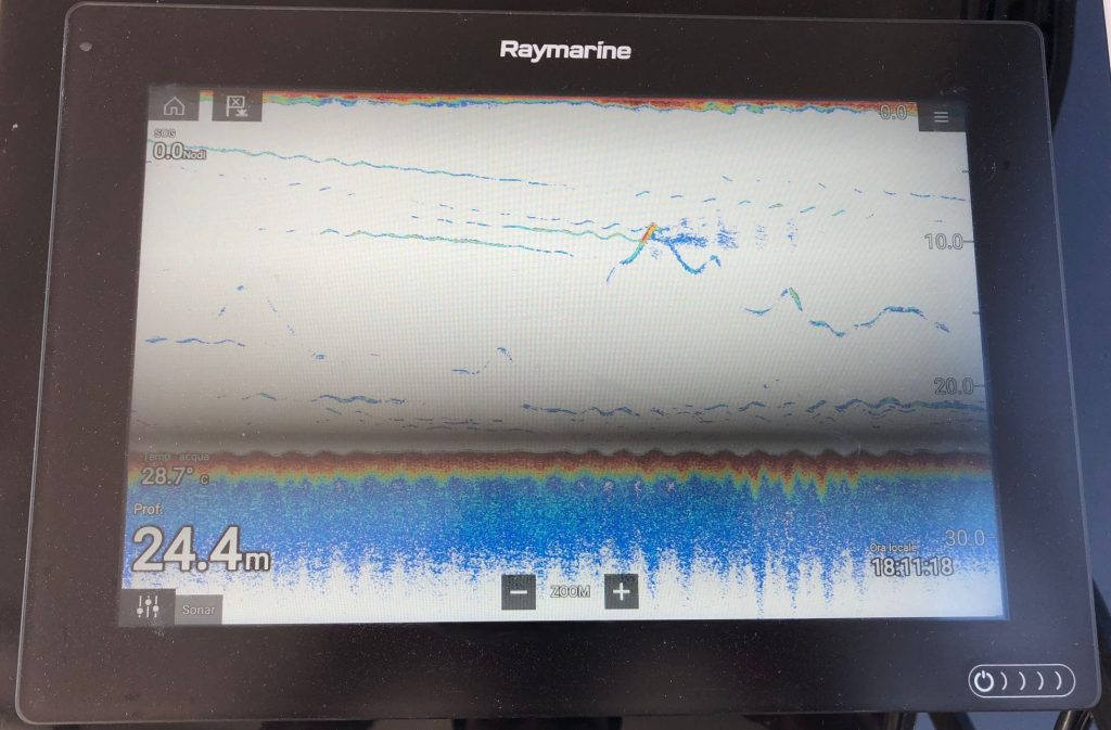 Quando arriviamo in zona cominciamo a guardare sia sopra che sotto la superficie. Cioè controlliamo se ci sono pesci che saltano o gabbiani che svolazzano e contemporaneamente manteniamo un’occhio sullo scandaglio. Mentre facciamo questa operazione di ricognizione al minimo cominciamo a pasturare.