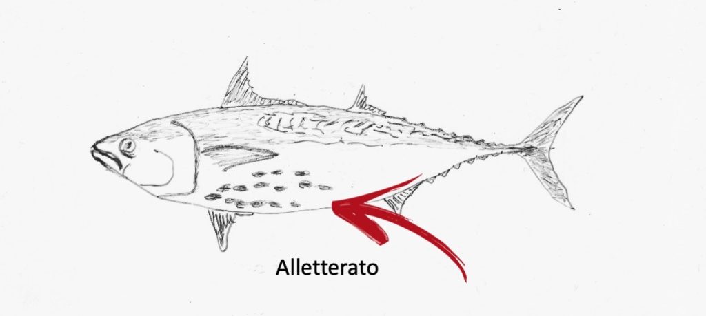 Il tonno alletterato è forse quello piu semplice da individuare, presenta delle vistose macchie nere sulla pancia chiara che ne fanno un facile carattere distintivo. Le macchie possono essere due o tre o molte di più dipende dalle dimensioni e dalla zona di cattura ma comunque risultano facili da vedere.