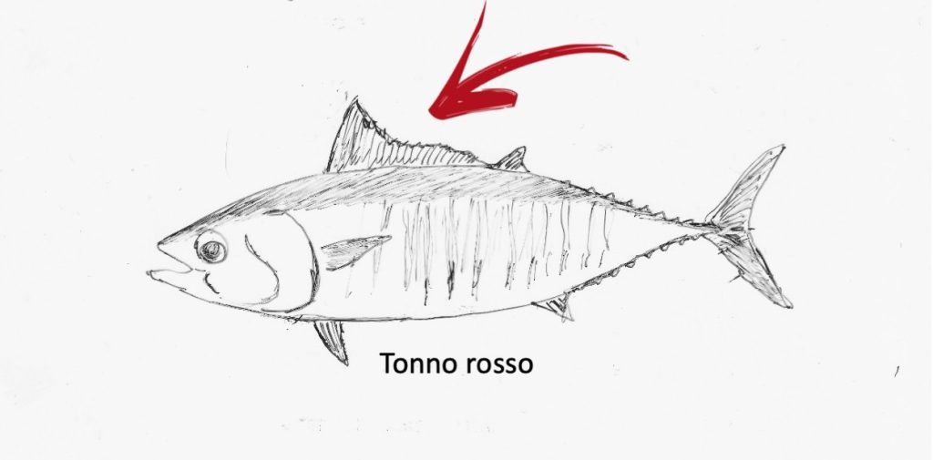 Quello che è sicuramente il principale segno distintivo per evitare di trattenere a bordo  un piccolo di tonno rosso riguarda le due pinne dorsali. Sia l’alletterato che il tombarello hanno due pinne completamente separate tra loro, mentre il tonno rosso o tonnella ha la prima pinna dorsale (quella più vicina all’occhio) che si allunga fino a toccare la seconda (quella più vicina alla coda).